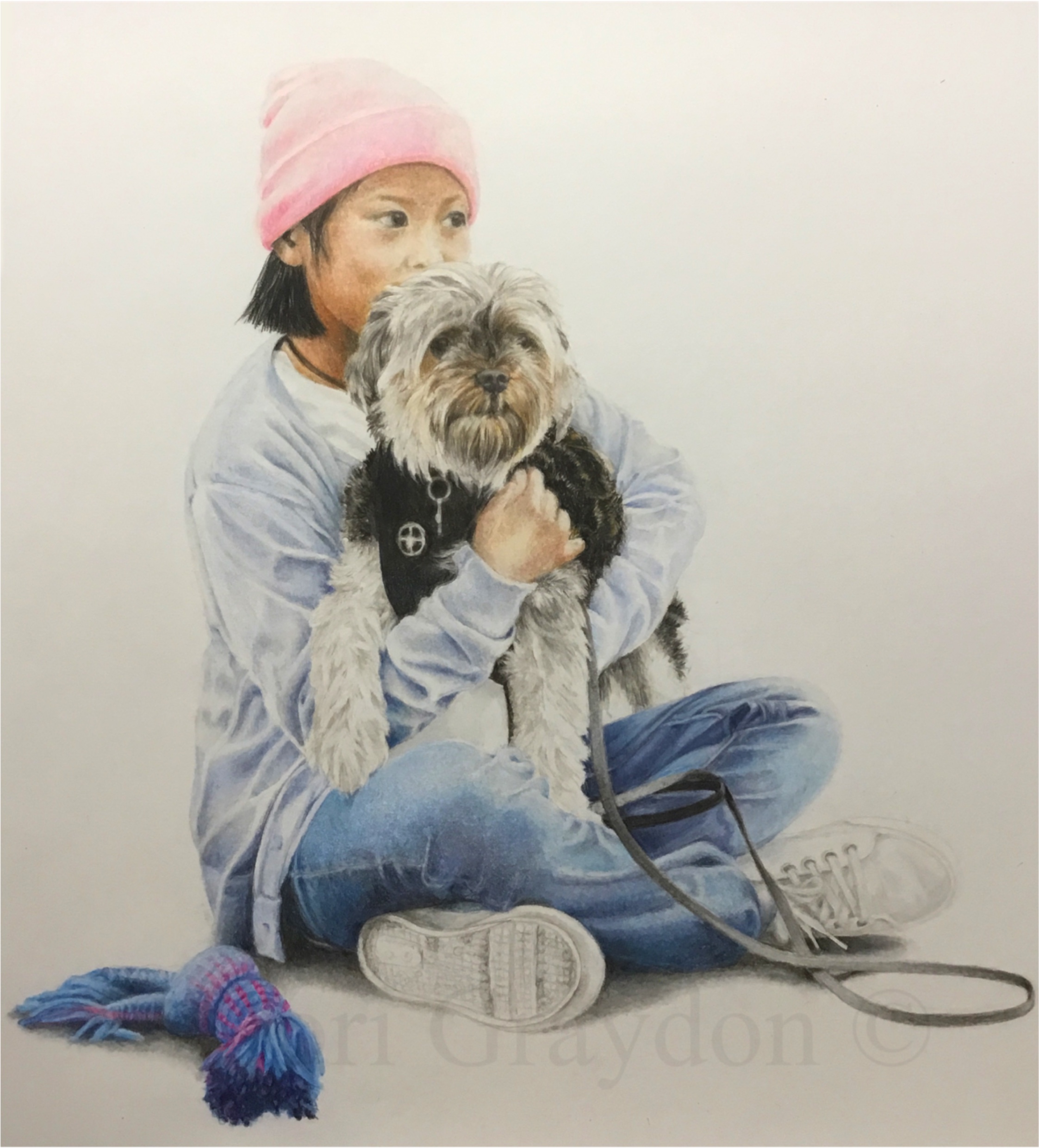 I often use reference photos from free stock sites like Pexels and Pixabay. This picture of the boy and his dog captured my interest as the subject for my next drawing. I’ve used coloured pencil on smooth bristol. A drawing takes longer to complete than watercolour but I love working in both mediums.
