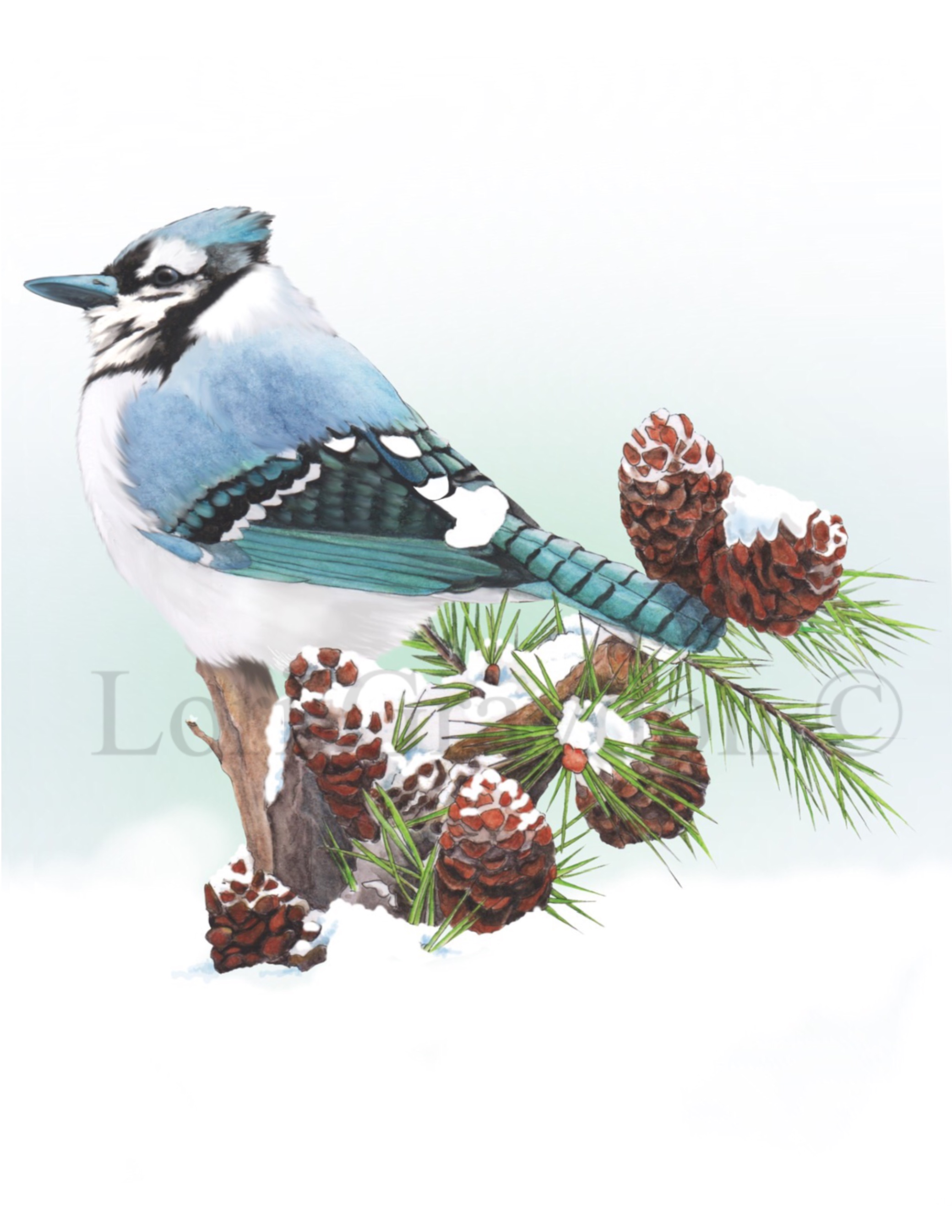 I did a Christmas arts and craft fair last November.  To add a bit of Christmas to my work I  thought a couple of birds in the snow would be nice.  It was fun because I hardly ever get a chance to draw or paint birds.  This Blue Jay is one of the illustrations I created to put on a greeting card.  The pinecones seemed pretty festive too I thought.