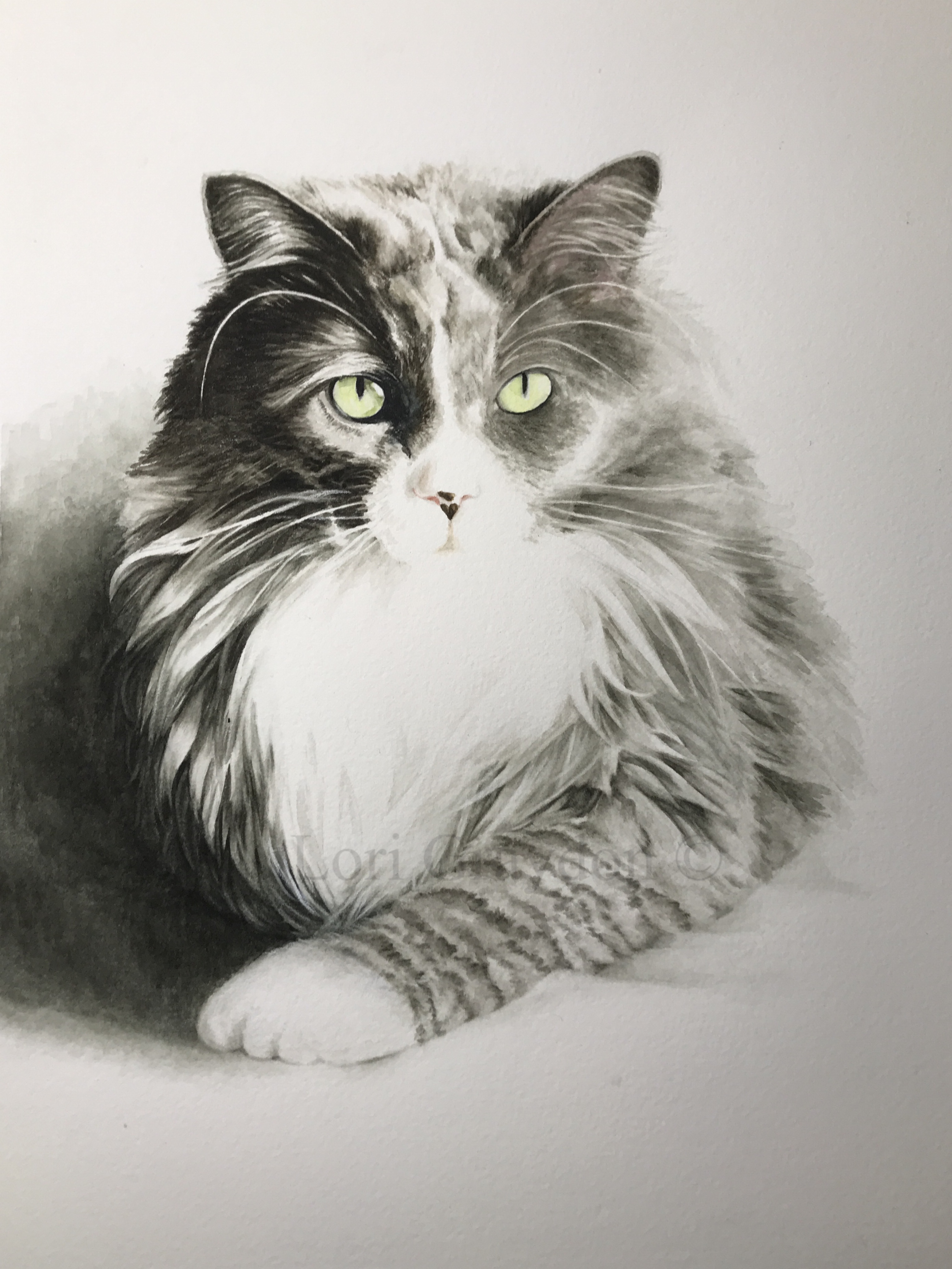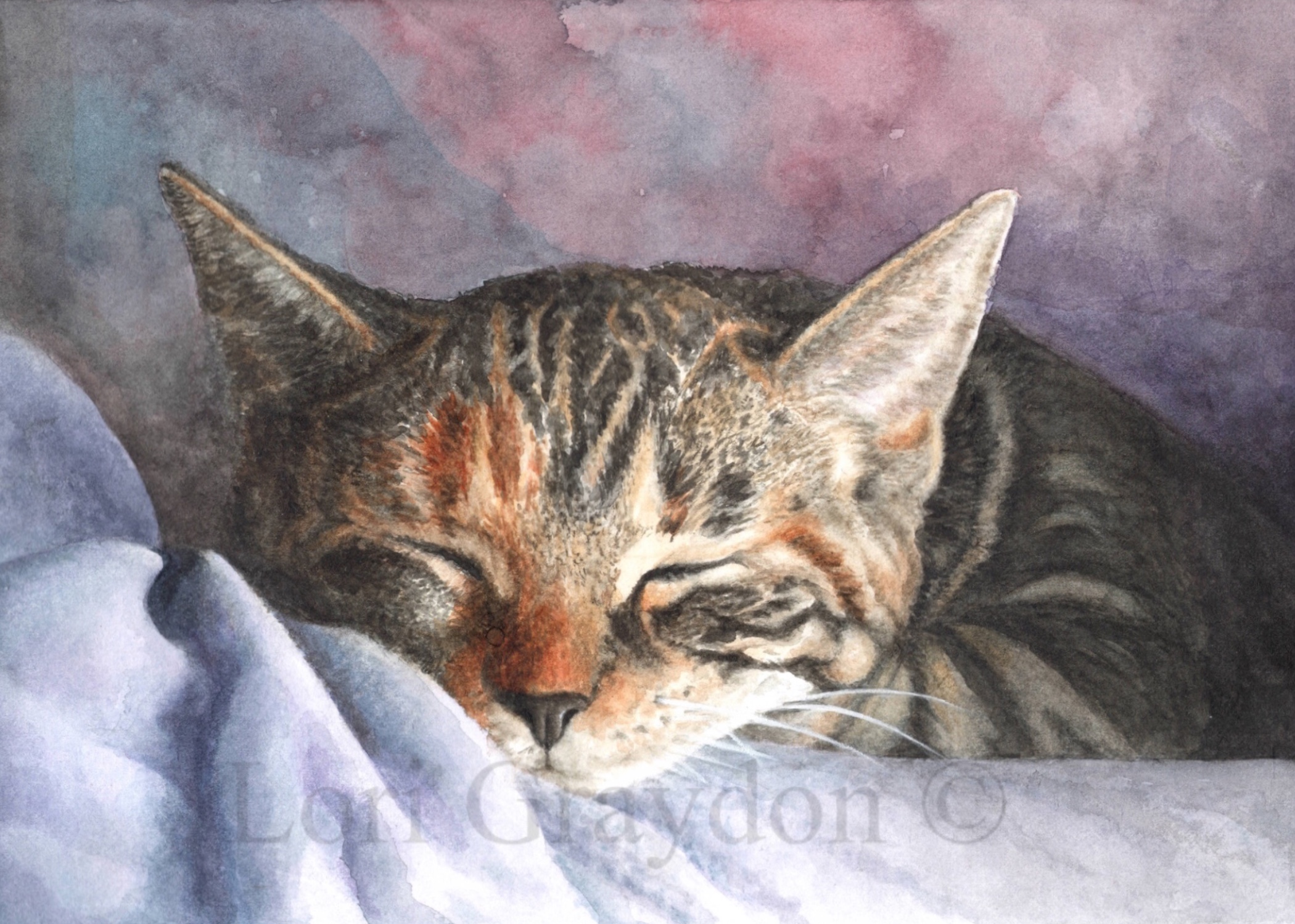 I don’t often get the chance to draw cats. A photo of a sleeping cat in Pixabay looked like a good subject to paint. I settled on doing the portrait in watercolour instead of coloured pencil. Photo credit: Kavowo